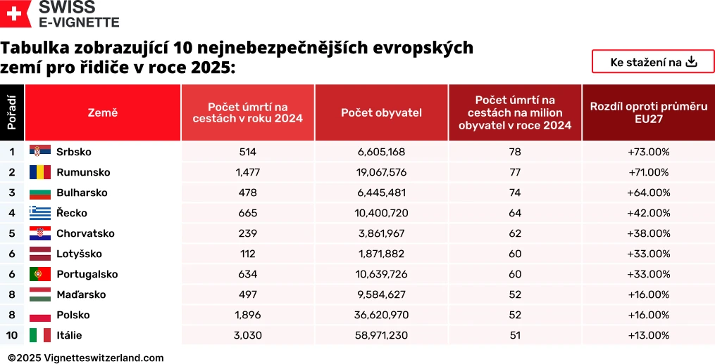 - Srbsko pro rok 2024 vede žebříček nejnebezpečnějších evropských zemí pro řidiče s až 78 úmrtími na cestách na milion obyvatel.
