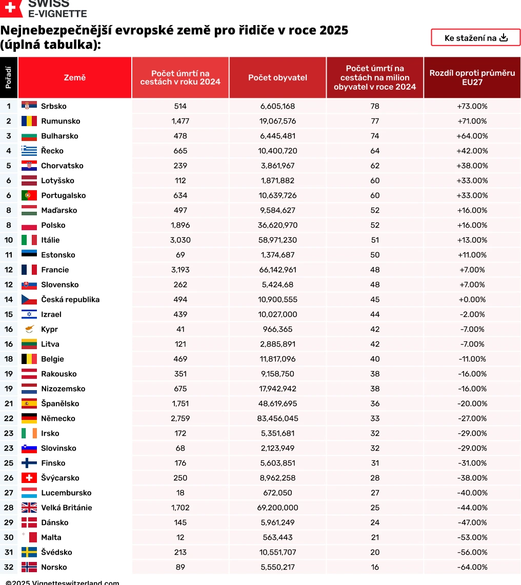Portál Vignetteswitzerland.com analyzoval nejnovější údaje ze zprávy Evropské rady pro bezpečnost dopravy (ETSC) Performance Index (PIN) 2025, aby porovnal bezpečnost na silnicích v evropských zemích a sestavil žebříček zemí na základě údajů o úmrtích na silnicích v roce 2024.