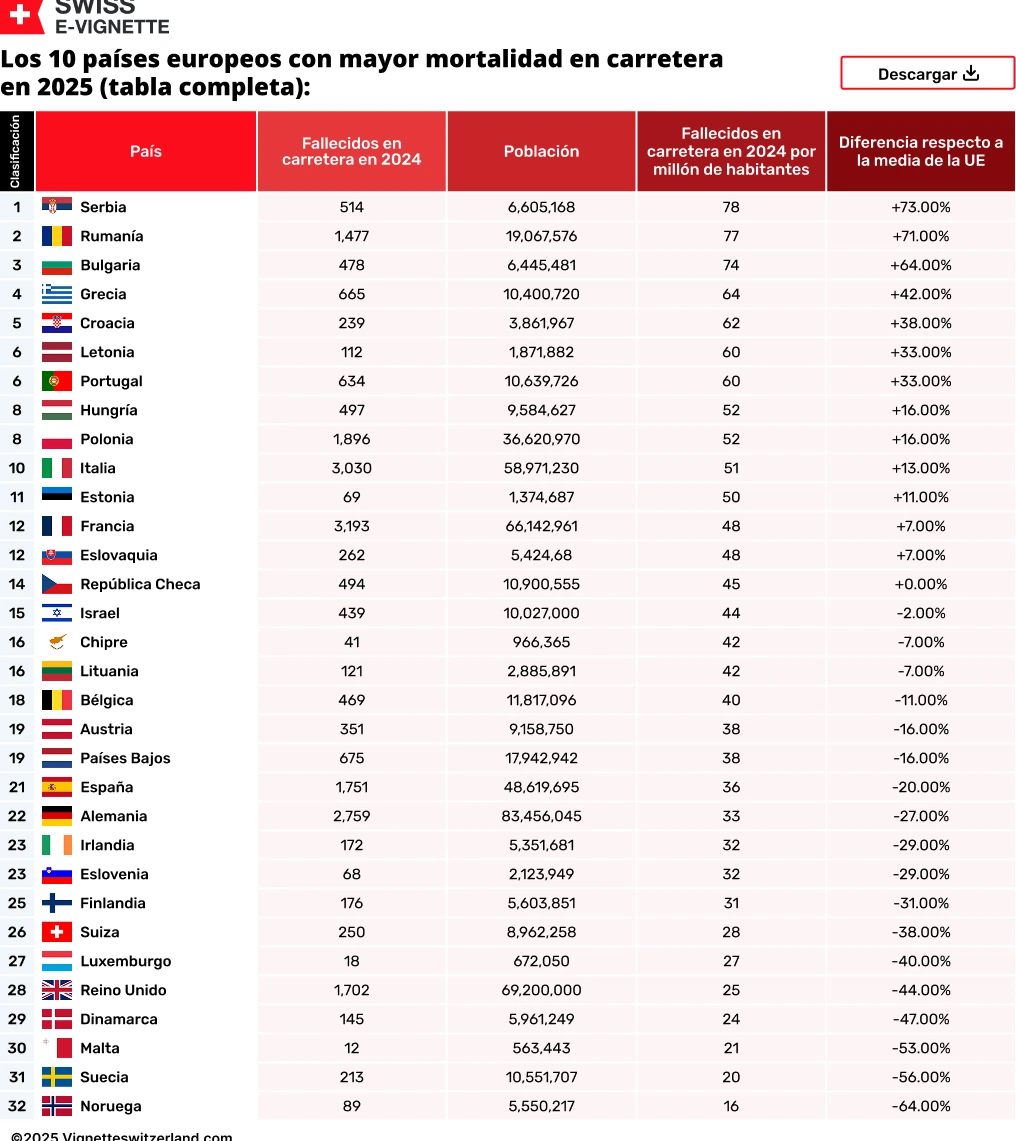 Rumanía ocupa el segundo lugar con 77 fallecidos por millón de habitantes, mostrando una ligera mejora respecto a las 81 fallecidos por millón de 2023, pero manteniendo su posición entre las carreteras más peligrosas de Europa.