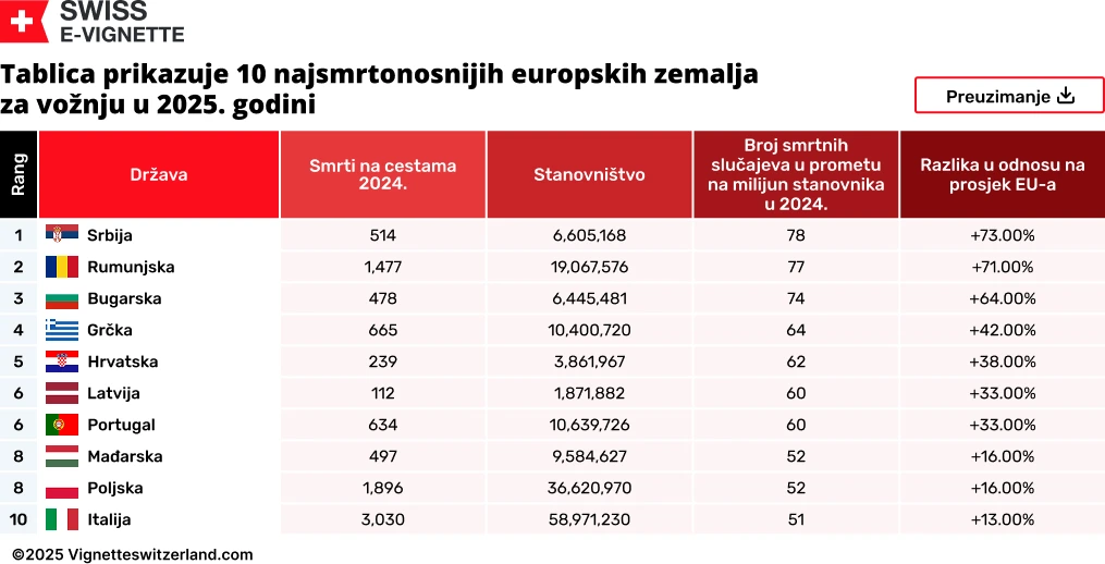 Vignetteswitzerland.com analizirao je najnovije podatke iz izvješća (PIN) koje je izdalo Europsko vijeće za sigurnost prometa (ETSC) za 2025. godinu kako bi usporedio sigurnost na cestama u europskim zemljama, te napravio poredak država na temelju broja smrtnih slučajeva u prometu u 2024. godini.
