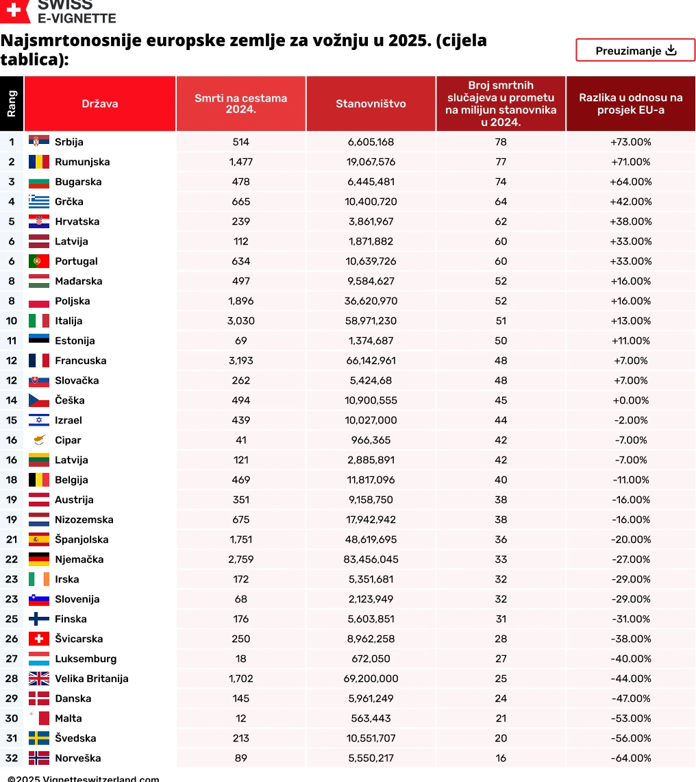 Srbija predvodi popis sa 78 smrtnih slučajeva na cestama na milijun stanovnika u 2024. godini, što je čini najopasnijom zemljom za vozače u Europi. Ovo ujedno predstavlja i značajno pogoršanje u odnosu na treće mjesto u našoj prethodnoj analizi, gdje je 2023. godine Srbija zabilježila 76 smrtnih slučajeva na milijun stanovnika.