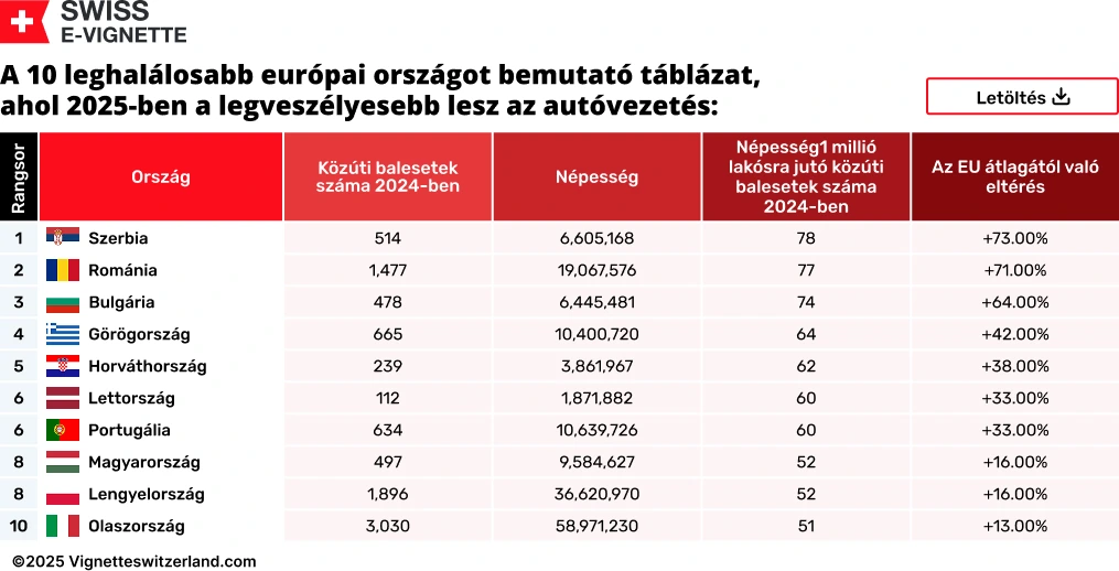 Szerbia vezeti a listát, ahol 2024-ben egymillió lakosra vetítve 78 halálos közúti baleset jutott, így egész Európában ez az ország számít az autósok számára a legveszélyesebb országnak. Ez jelentős hanyatlást jelent az előző tanulmányunkban elfoglalt harmadik helyhez képest, ahol 2023-ban 76 halálos áldozatot regisztráltak egymillió lakosra vetítve.