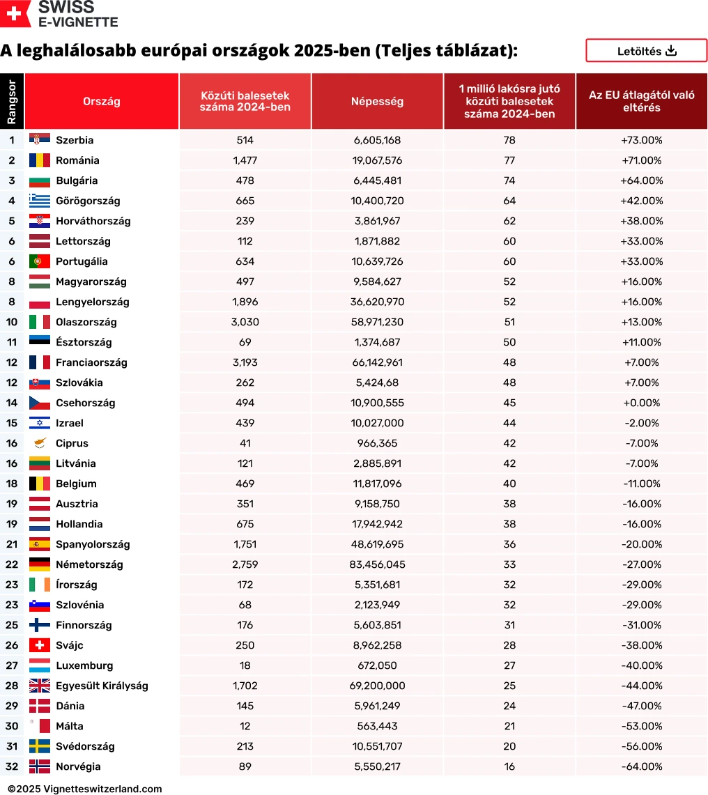 A Vignetteswitzerland.com elemezte az Európai Közlekedésbiztonsági Tanács (ETSC) Performance Index (PIN) 2025 jelentéséből származó legfrissebb adatokat, hogy összehasonlítsa az európai országok közúti biztonságát, és a 2024-es halálos közúti balesetek számai alapján rangsorolta az egyes nemzeteket.