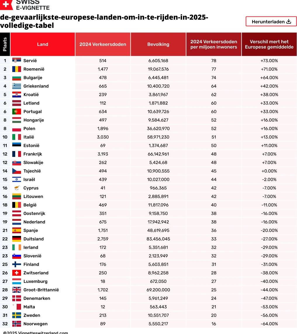 - Servië staat bovenaan de lijst als het Europese land waar het het gevaarlijkst is om te rijden, met 78 verkeersdoden per miljoen inwoners in 2024.