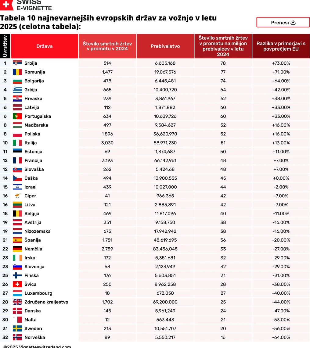 Srbija vodi lestvico z 78 smrtnimi žrtvami v prometu na milijon prebivalcev v letu 2024, s čimer postaja najnevarnejša država za voznike v Evropi. To predstavlja opazno poslabšanje v primerjavi s tretjim mestom v naši prejšnji raziskavi, kjer je leta 2023 zabeležila 76 smrti na milijon prebivalcev.