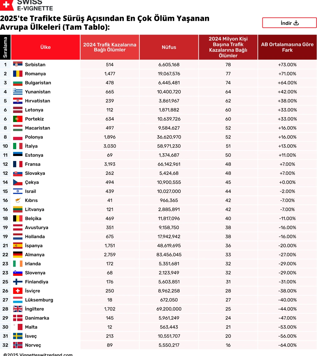 Vignetteswitzerland.com, Avrupa Ulaştırma Güvenliği Konseyi'nin (ETSC) Performans Endeksi (PIN) 2025 raporundan alınan son verileri analiz ederek, Avrupa ülkeleri genelindeki yol güvenliğini karşılaştırdı ve ülkeleri 2024 trafikte ölüm rakamlarına göre sıraladı.